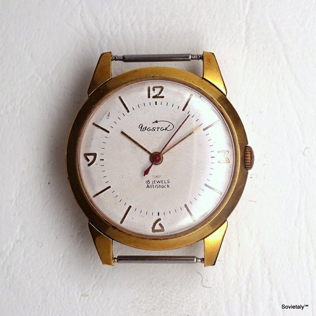 Il Vostok ha un quadrante decorato con un piccolo missile, iscrizioni in inglese che recitano "Antishock 18 Jewels". La cassa è realizzata in ottone dorato e mostra un design semplice e classico, con indici dorati. L'orologio presenta lancette dorate, indici dorati, e una cassa di forma rotonda.